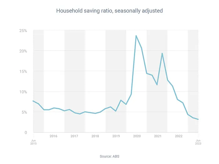 The latest Australian Bureau of Statistics data show that the share of income that households save fell significantly between the quarters of September 2021 and June 2023: